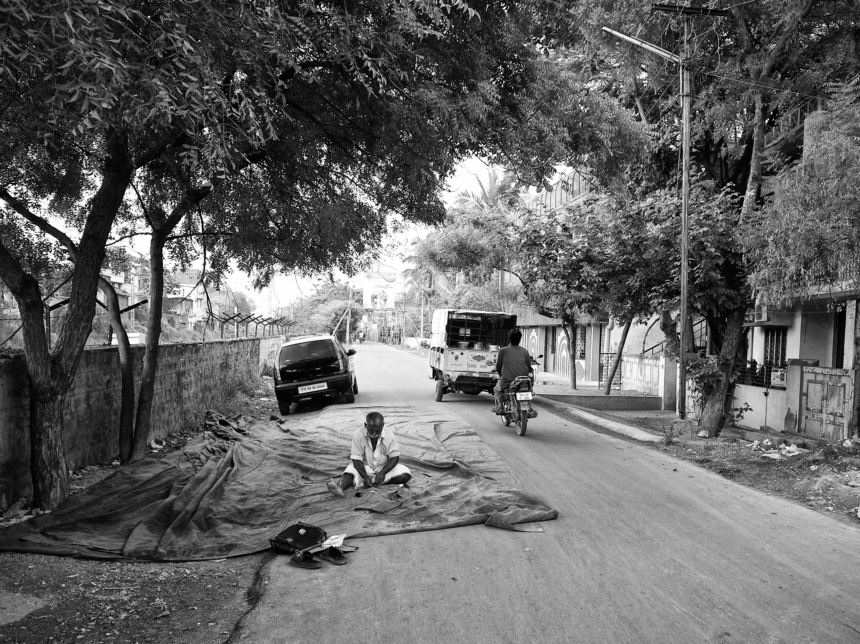 A craftsman repairing a tarpaulin by the road side. Virudhunagar, India