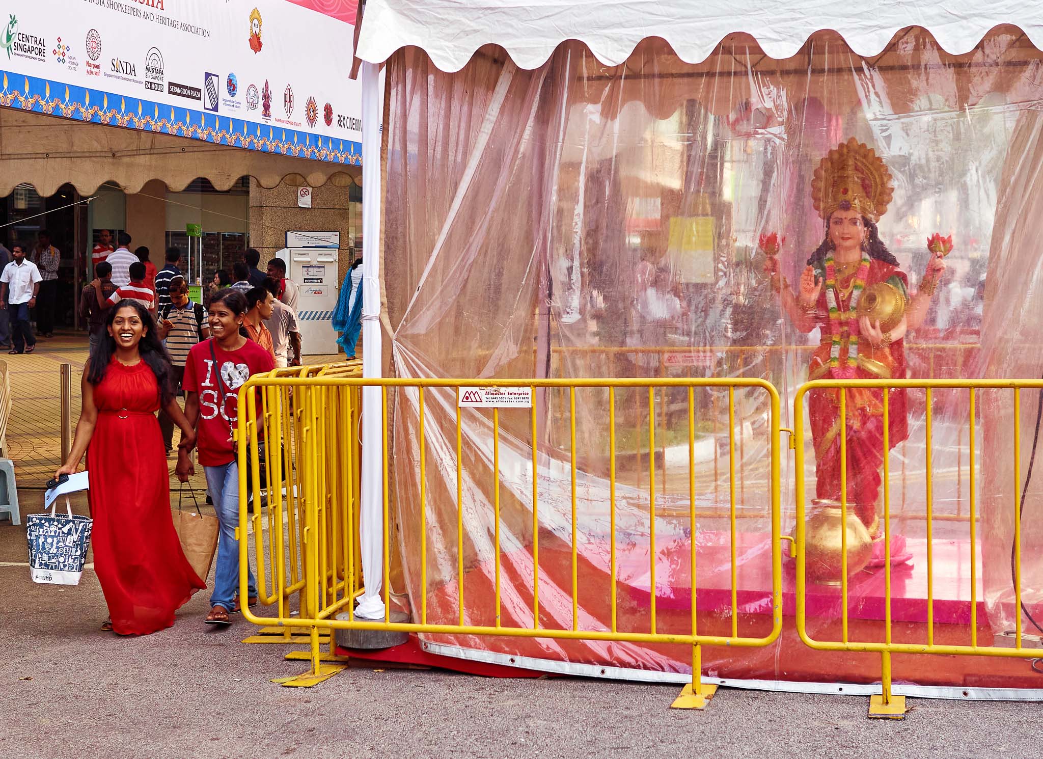 Shoppers passing by the yet-to-be unveiled statue of Goddess Lakshmi behind the plastic curtains, Little India, Singapore