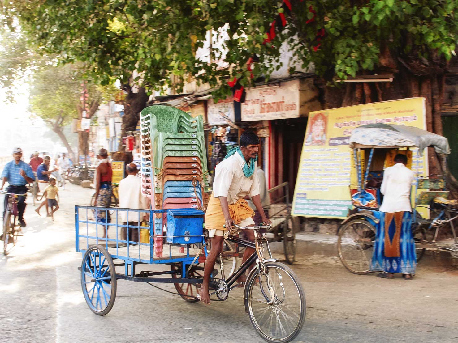 A delivery man riding his tricycle with a stack of chairs, Madurai, Tamil Nadu, India.