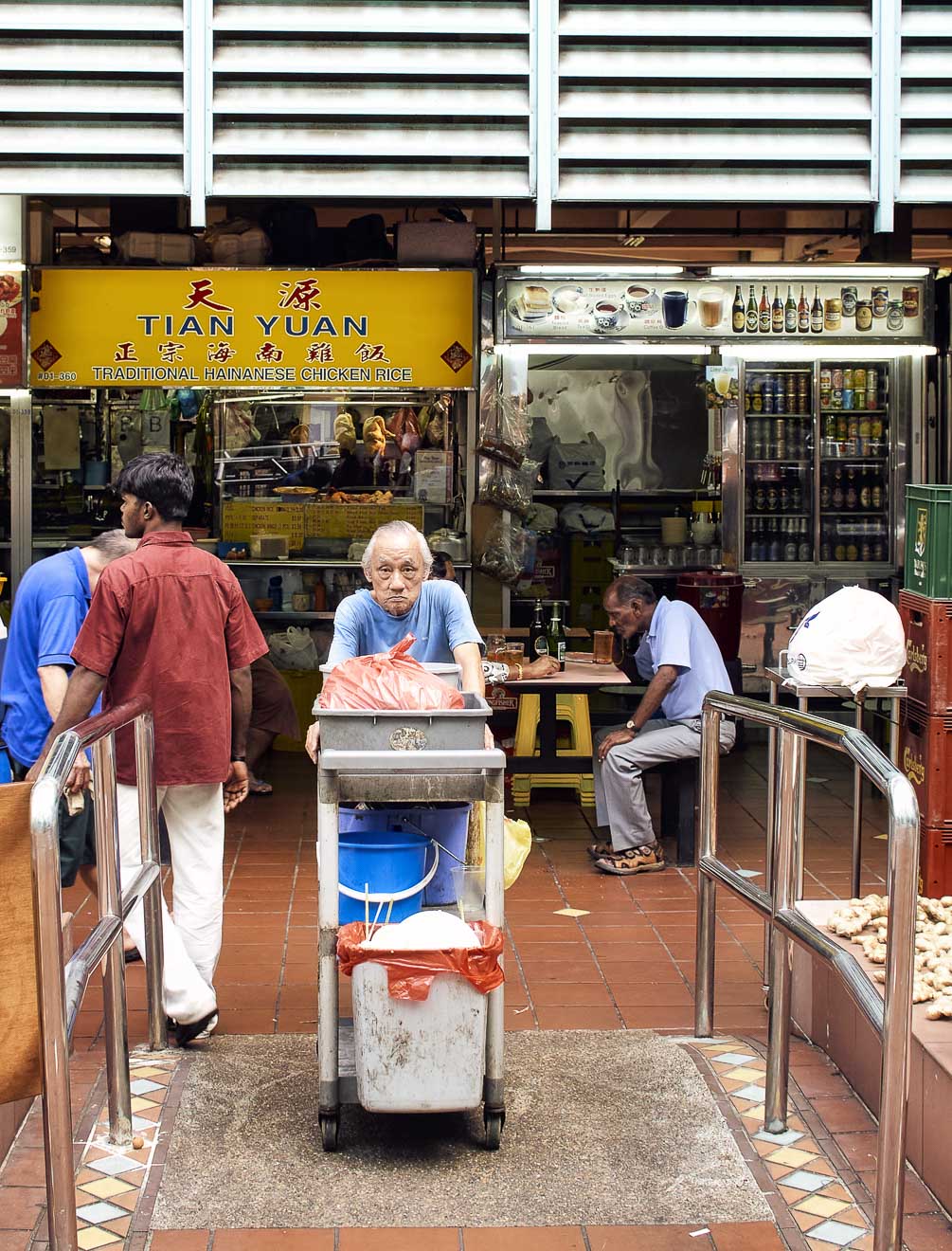 An elderly cleaner taking away plates for cleaning at Tekka Market hawker center, Little India, Singapore