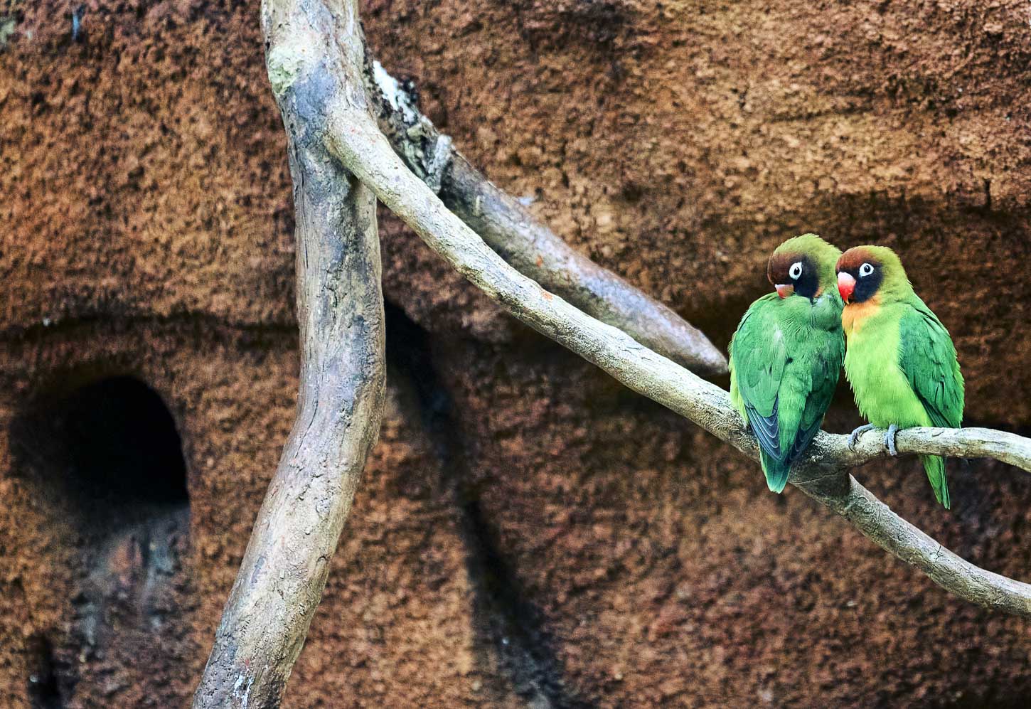A pair of black-cheeked lovebirds at Mandai Bird Paradise, Singapore