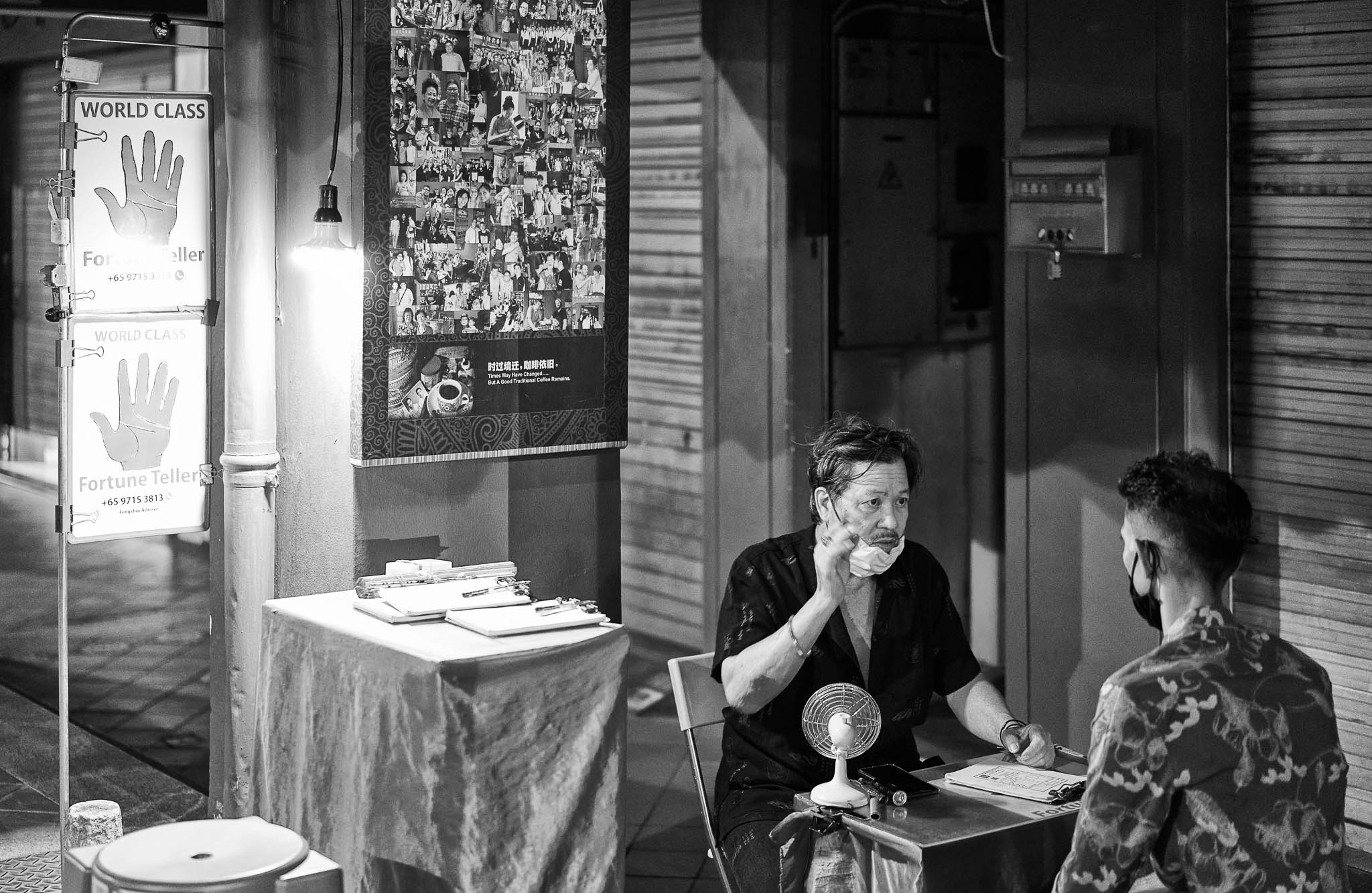 A fortune teller awaiting for his customers by the street side, Bugis, Singapore