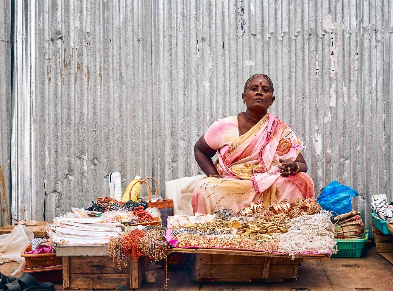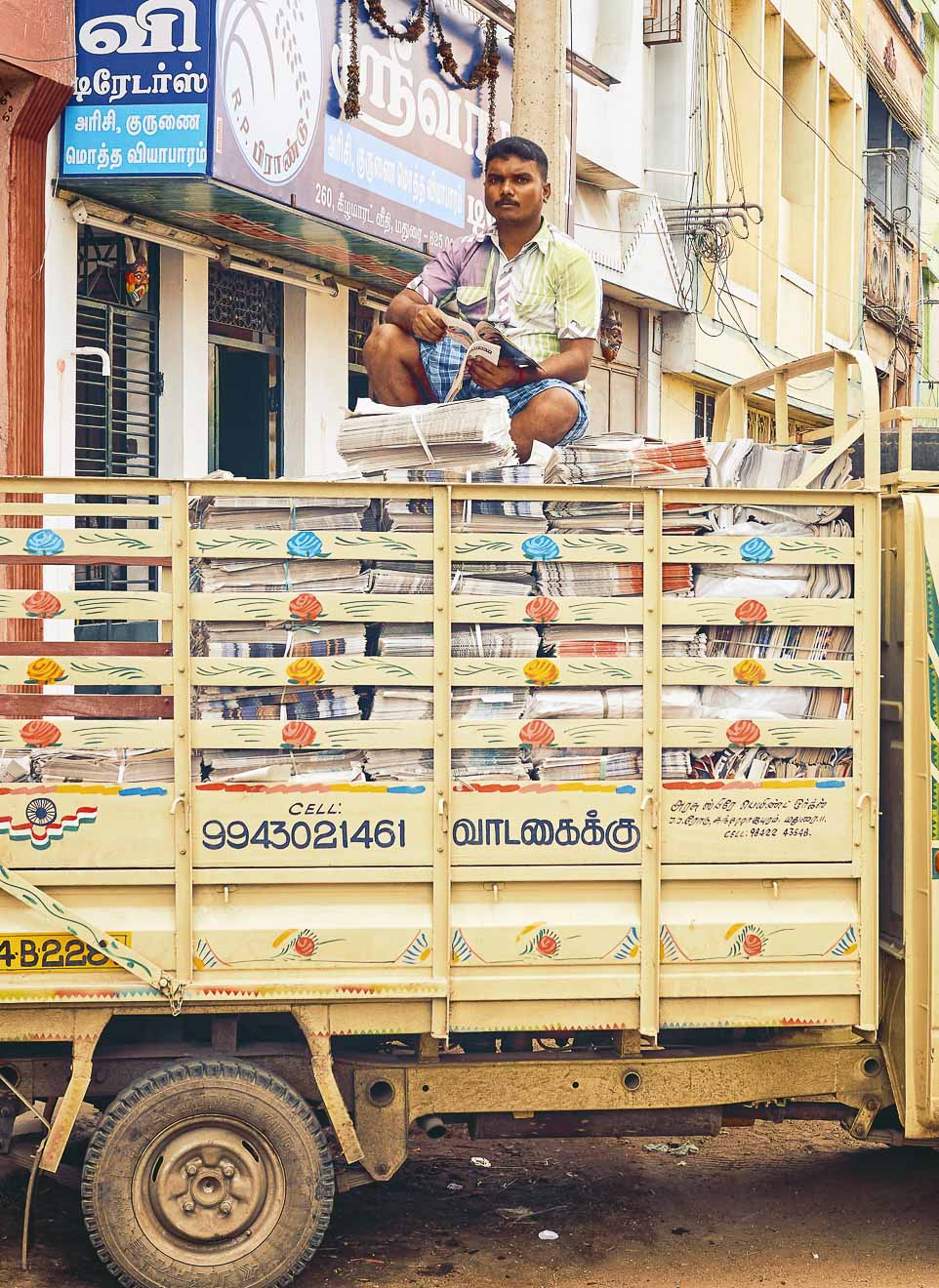 She was wearing a man’s long sleeve shirt over her saree, and balanced herself on a moving lorry by holding onto the rails. But her face didn’t show any hardship.