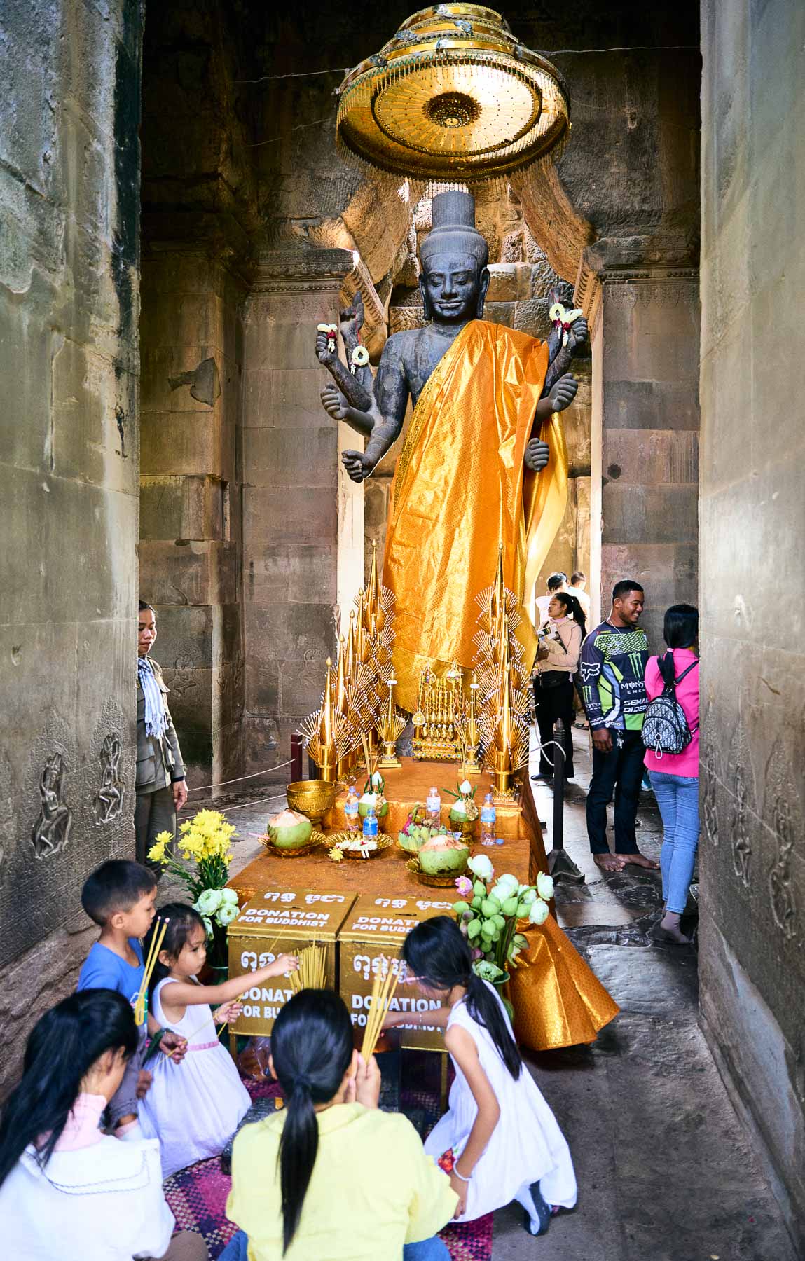 A cambodian family and kids offering and praying at the tall Vishnu statue, known as Ta Reach, at Angkor Wat, Siem Reap, Cambodia