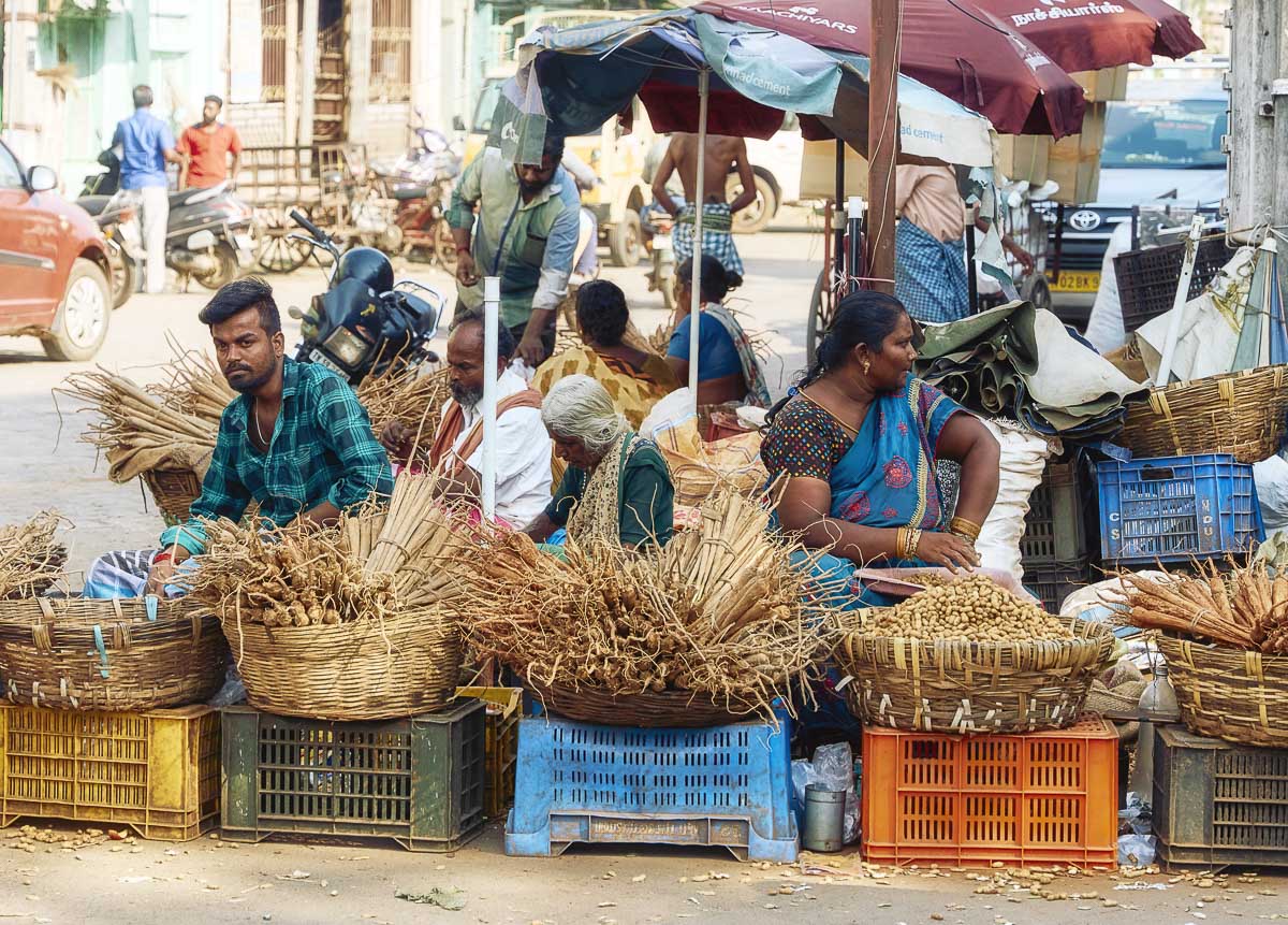 Street vendors selling Palmyra sprouts and groundnuts, at East Masi St, Madurai, Tamil Nadu, India