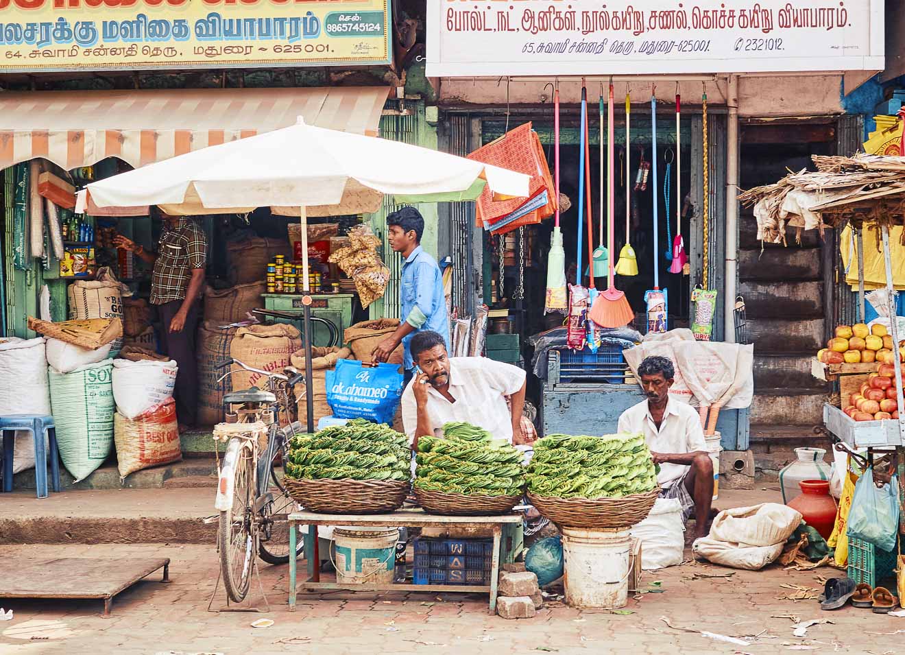 A betel leaf seller at his street market shop, Madurai, Tamil Nadu, India