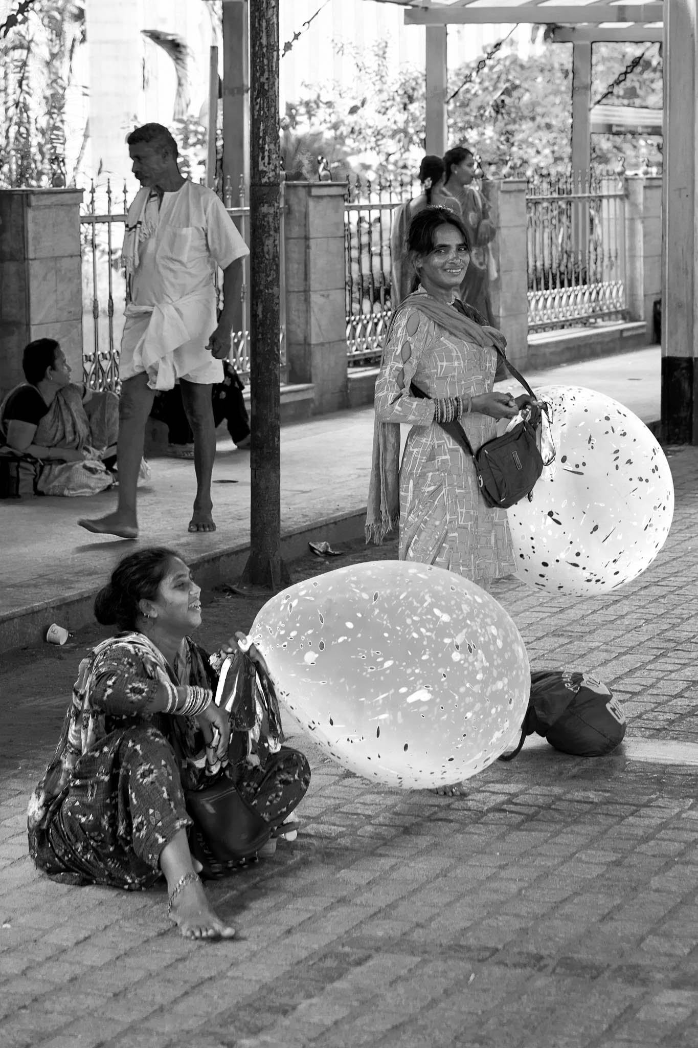 Two young women selling big balloons by the street side, Madurai, Tamil Nadu, India