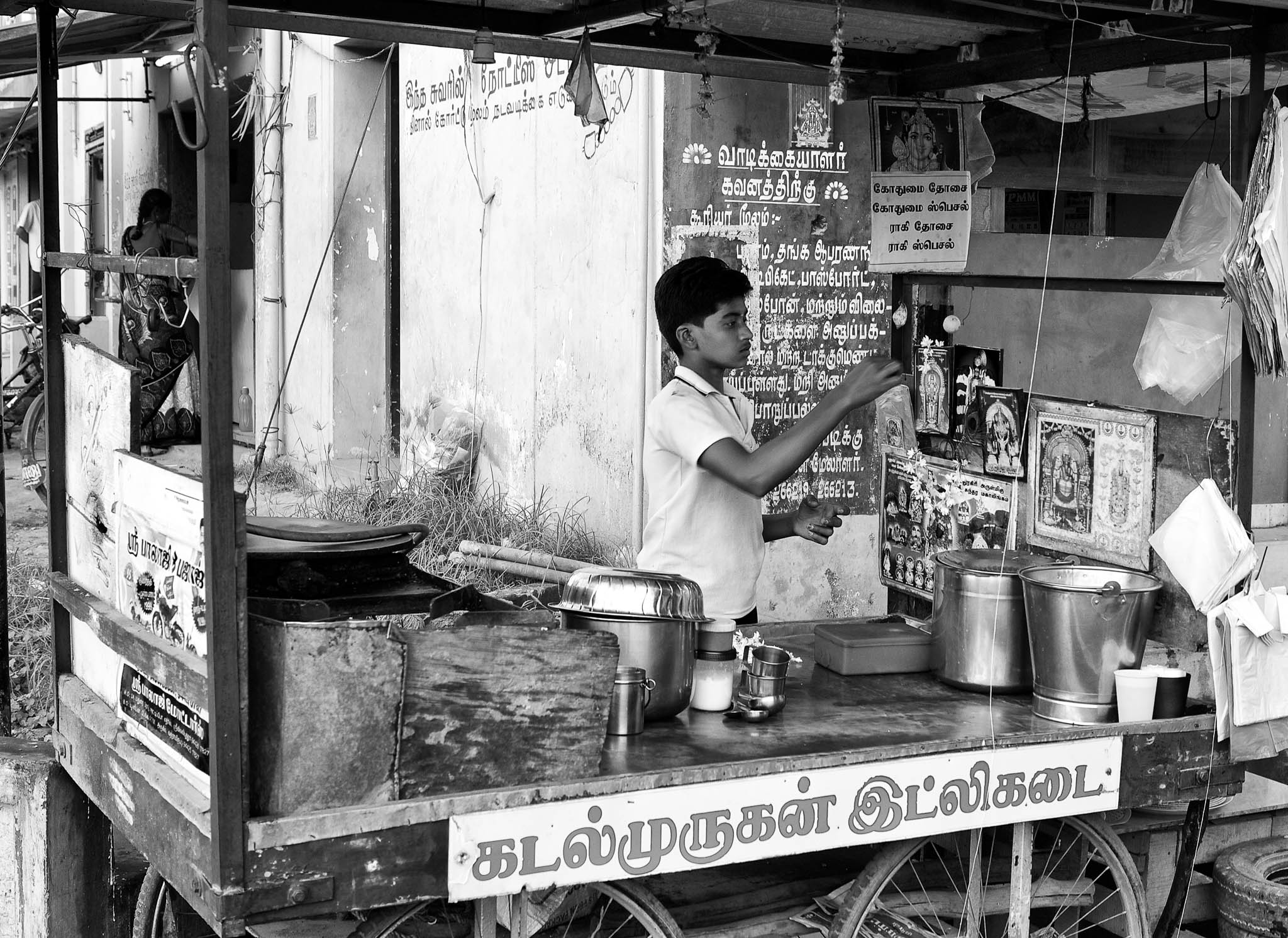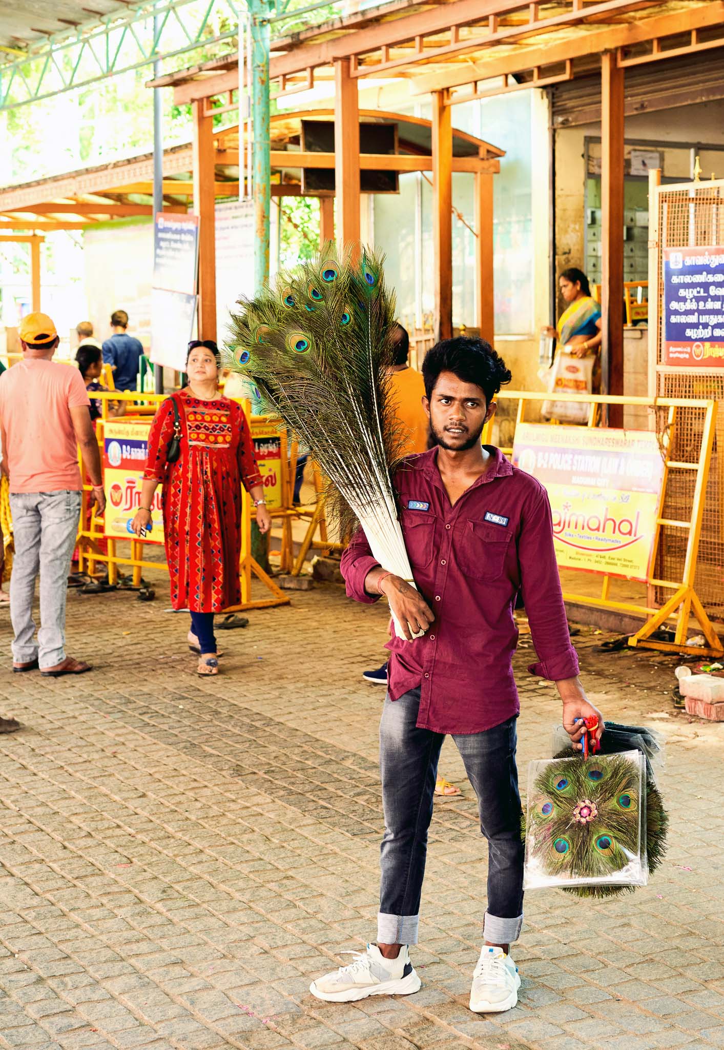 A young man selling peacock feathers, Madurai, Tamil Nadu, India